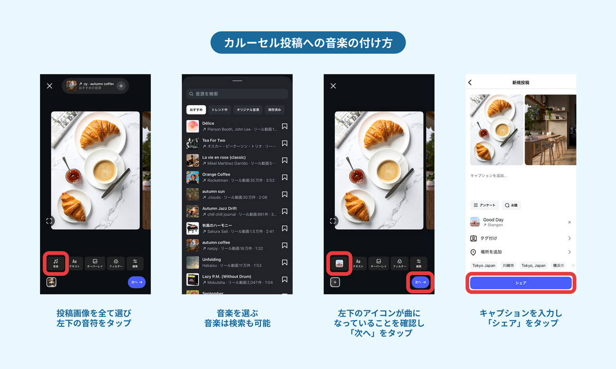 さらに、より多くのユーザーにリーチするためにも、音楽を付けることがおすすめです。音楽を添えたカルーセル投稿は、リールタブに表示される可能性が高まり、フォロワー外のユーザーに届きやすくなります。