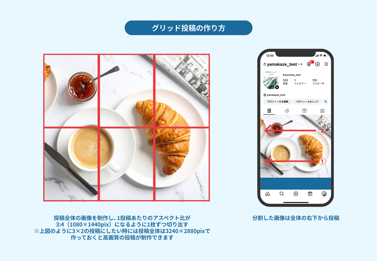 また、フィード投稿にはグリッド投稿という手法もあります。これは、1枚の画像を複数枚(例:3×3、3×6)に分割し、プロフィール上で一つの大きなアートのように見せるテクニックです。プロフィールページを訪れたユーザーに強い印象を与え、ブランドの世界観をより深く伝えることができます。