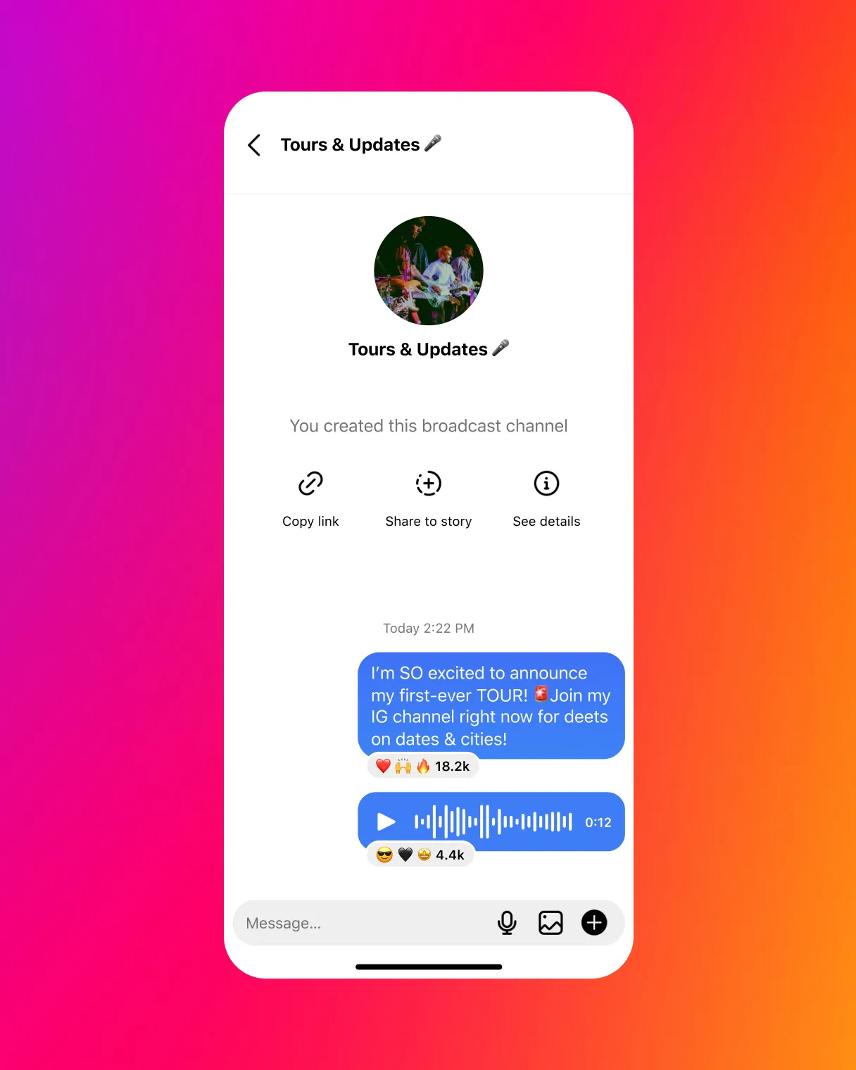一斉配信チャンネルは、ブランドやクリエイターが大勢のフォロワーと直接交流できる、1対多のメッセージツールです。テキストや写真、動画、ボイスノート、アンケートを使って近況や舞台裏の一コマを発信でき、ストーリーズのように24時間で消えることがないため、後からでも内容を確認できます。