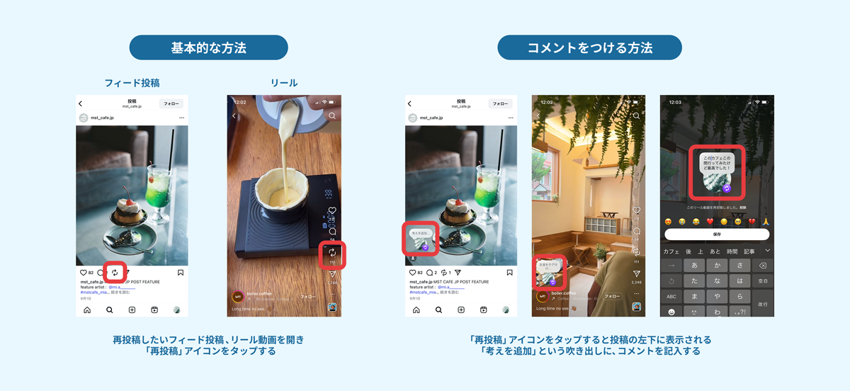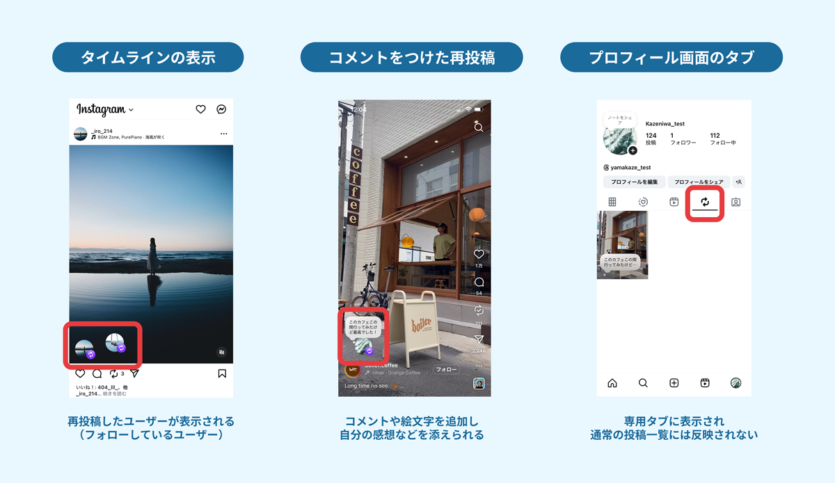 「共同投稿(コラボ投稿)」と似ていますが、共同投稿が一つの投稿を複数アカウントの投稿として表示するのに対し、再投稿はあくまで「紹介者」の立場でコンテンツをシェアする仕組みです。