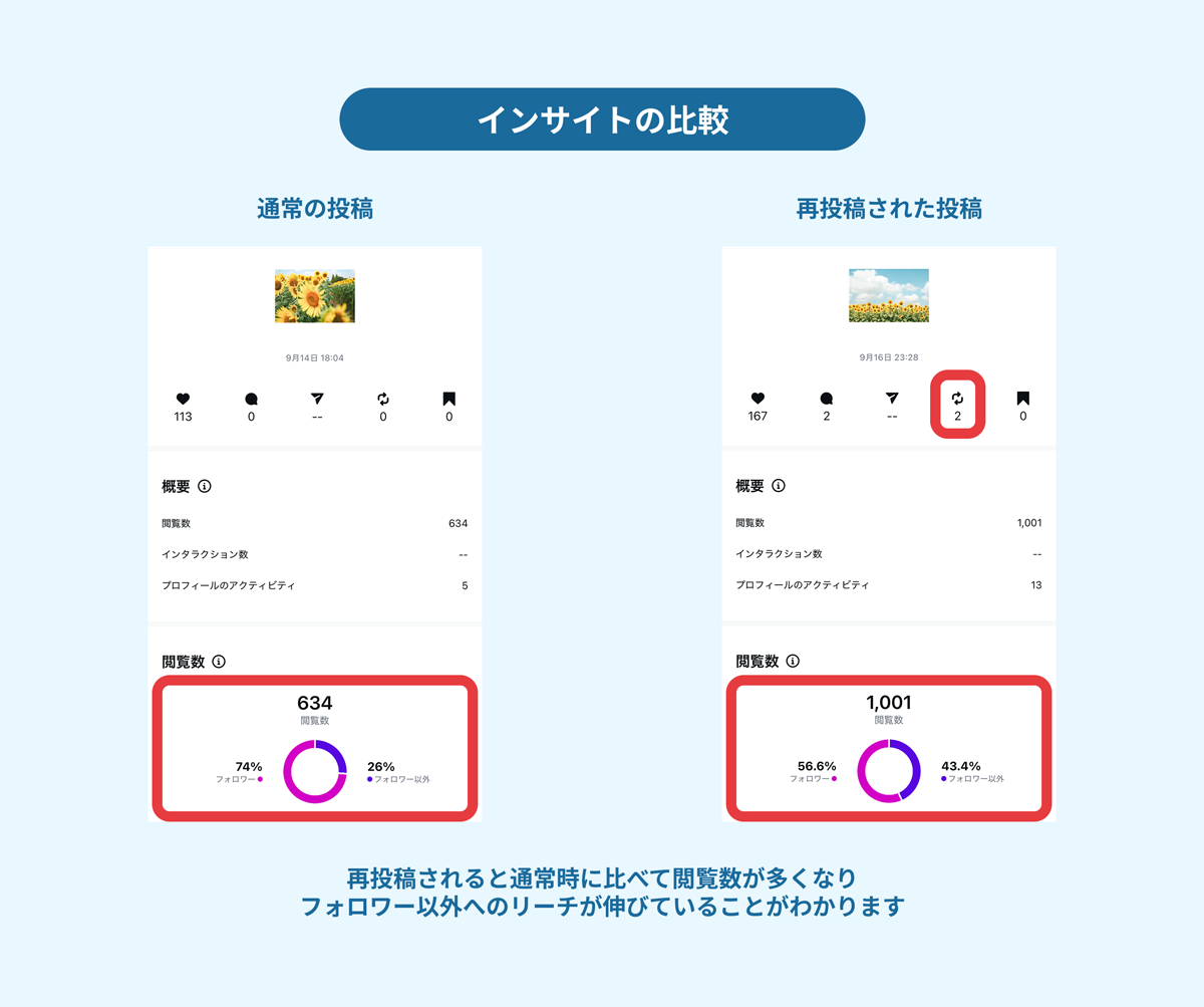 コンテンツは、再投稿者のフォロワーのフィードにも表示されるため、これまで以上にコンテンツが拡散され、フォロー外からの閲覧数などを増やすことができます。