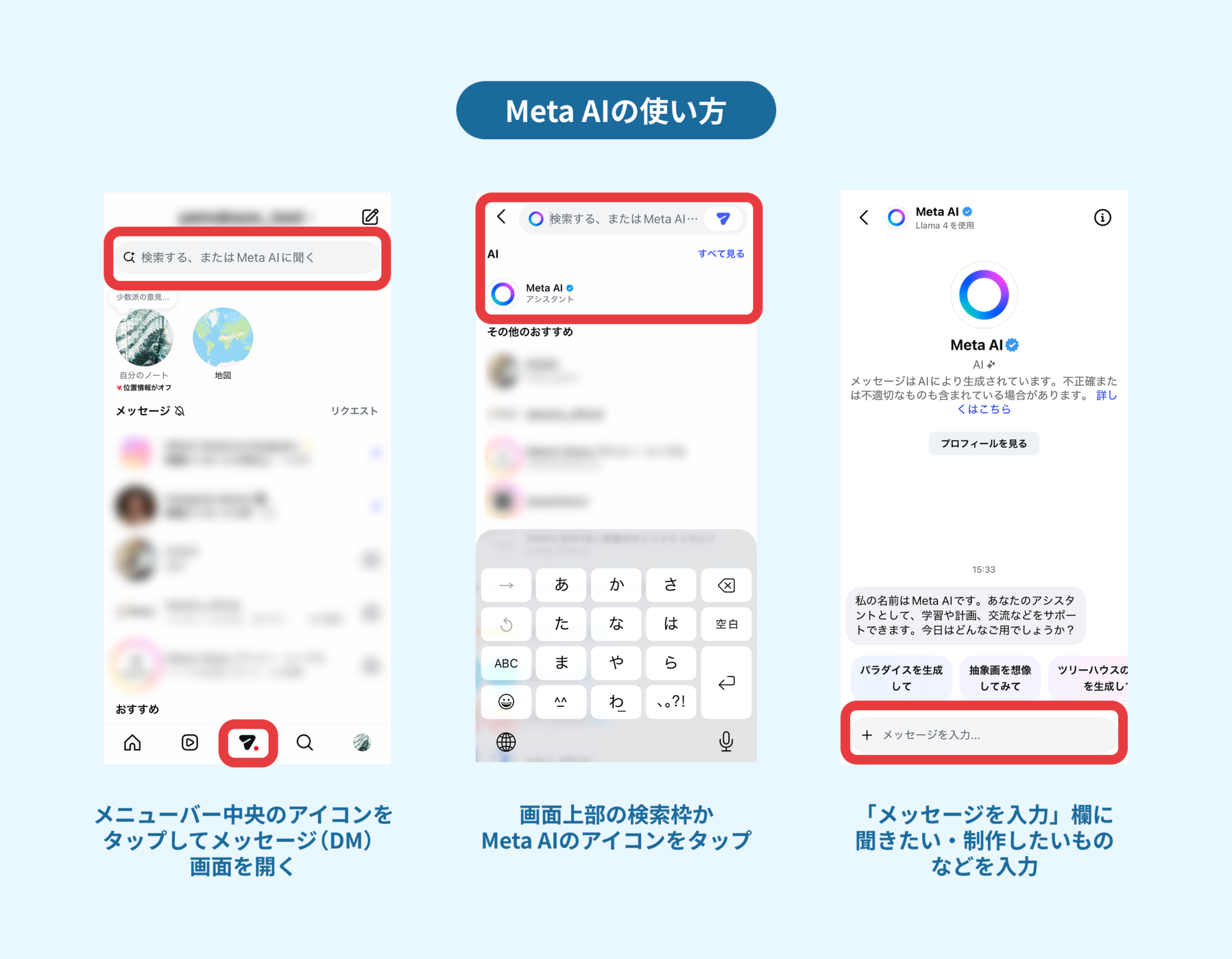 アプリ内に表示されるアイコンをタップしたり、グループチャット内で「@Meta AI」と入力することで呼び出すことができます。また、ウェブサイト(meta.ai)からも利用可能です。